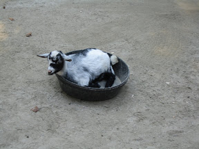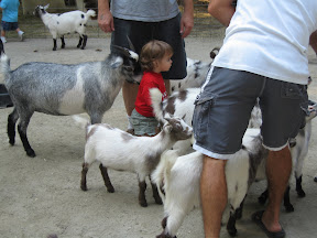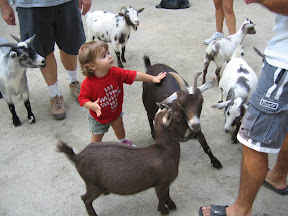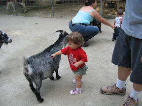 Then we took Grace into the petting zoo, which was really just an area with a bunch of goats that we about as tall as Grace. At first she didn't really know what to make of them especially when they surrounded her. I tried to get us some food to feed them from one of those gum ball machines but the goats are too smart. They know where the food comes from and were eating it before I could get it out. They crowded all around me and one nibbled my shorts so I freaked out and just put the food on the ground. We probably let Grace run around for 10 minutes and she touched a few goats.