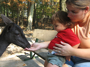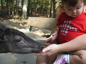 Southwick's had two really neat areas where you could interact with the animals. First we walked around the Deer Forest which was basically a big enclosure with deer that you can walk around in and feed the deer. As you can imagine the deer are not afraid of people. Grace and I sat on a bench while I tried to get the deer to come close. I had one eating out of my hand. The fun ended when another deer found out supply of corn in Grace's stroller and ate it.