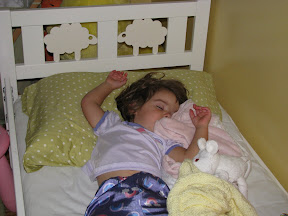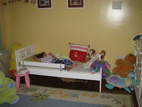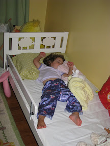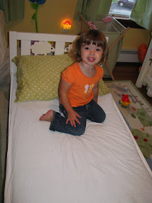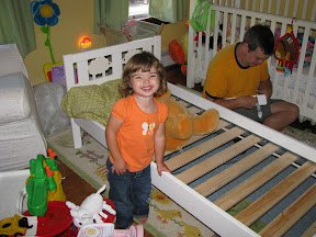 Daddy and I had decided that by the end of summer we would move Grace to a toddler bed. The plan was that we would take Grace to Ikea and let her pick out a bed. Once we realized she could climb out of her crib the project took on a new urgency, made only worse on vacation when Grace proved to be able to climb out of the pack-n-play too. Last Sunday we headed off to Ikea to buy a bed. Early on Grace made it clear that the one with the attached tent was her favorite. Unfortunately the tent was dark blue and therefore ruled out, but we did get the bed that the tent was attached to. Tuesday night Daddy assembled the new bed and after a little over tired crying, Grace slept the night away. Wednesday I only had to help her back to bed once before she finally fell asleep. Last night she went to sleep without a problem.