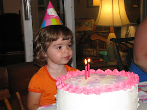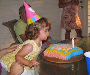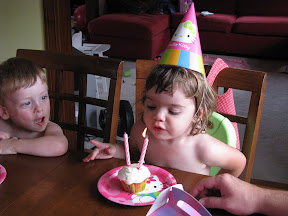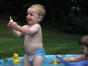 We started with a party at Grandma Gail's house with my side of the family. Grandma and Amy did a great job putting the little party together and we thank them very much. The only really damper on the day was the weather which was 100 degrees, overcast and very, very humid. Grace didn't notice as she spent most of the day in the kiddie pool that Amy brought over. Her cousin Gray joined in the fun too.