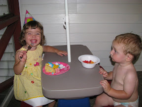 We finally got to break in Grandma's new picnic table. Do you think Gray was wondering why Grace got cake and he just got fruit?