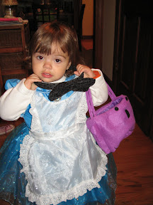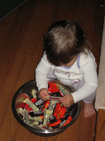 After Daddy and Grace returned Grace was happy to help Mommy hand out candy by picking thru the bowl and taking all of the candy out. Then putting some back in. She also enjoyed taking the small round candies and throwing them out the door when I opened it. She insisted on being next to that candy bowl picking thru it until we put her to bed. I know she didn't know that she could eat what was in the bowl. I don't think I will ever truly understand her fascination with the bowl of candy.