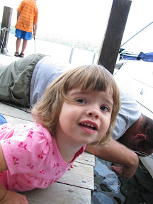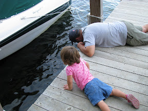 Ned and Nolan went off camping Sunday and when they returned on Monday the first thing Nolan wanted to do was go fishing. Grace and I went to watch the fishermen and arrived to Ned throwing a fish back in. Being the good uncle he is he decided to "cheat" and try to quickly catch a fish right off the edge of the dock. Grace decided she needed to lay next time him and watch. According to Grace she saw a pink fish.
