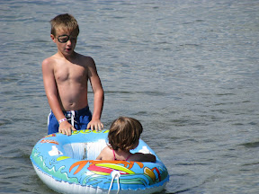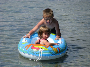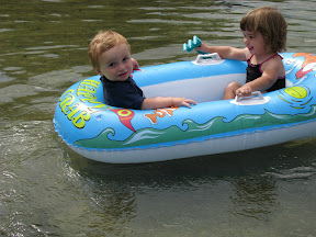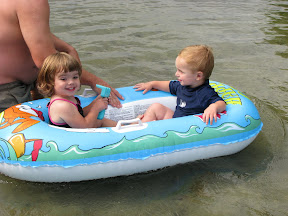Get the babies in the boat and take a picture. It was all fun and games until Grace put water on Gray, he started to cry and Grace laughed at him.